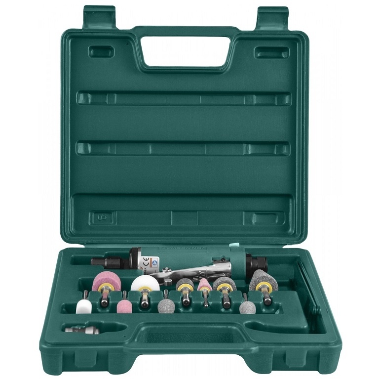 Набор бормашинка пневматическая 25000 об/мин., патрон 3/6 мм, L-152 мм с насадками, 15 предметов. Высокоскоростная пневматическая бормашина с набором насадок и аксессуаров применяется для локальной шлифовки, зачистки фасонных и профилированных поверхностей деталей, изготовленных из металлов, камня и т.п., в зависимости от применяемой насадки. При работе обязательно использовать средства защиты рук, органов зрения и слуха, а при обработке металлов защитные перчатки, изготовленные из материалов с огнестойкой пропиткой.