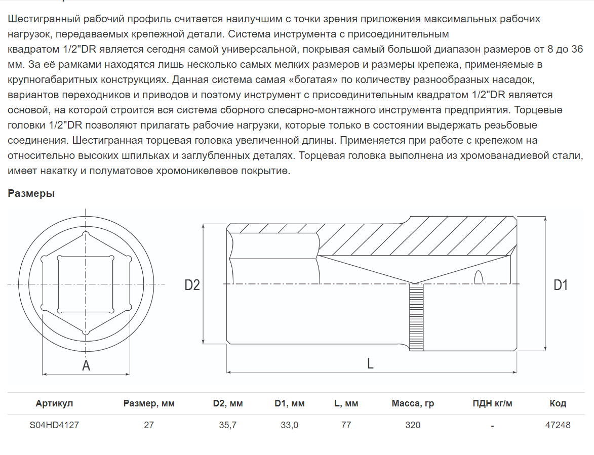Шестигранная торцевая головка увеличенной длины. Применяется при работе с крепежом на относительно высоких шпильках и заглубленных деталях. Торцевая головка выполнена из хромованадиевой стали, имеет накатку и полуматовое хромоникелевое покрытие. Изделие изготовлено по стандарту DIN 3124, полностью соответствует требованиям ГОСТа 25604-83.