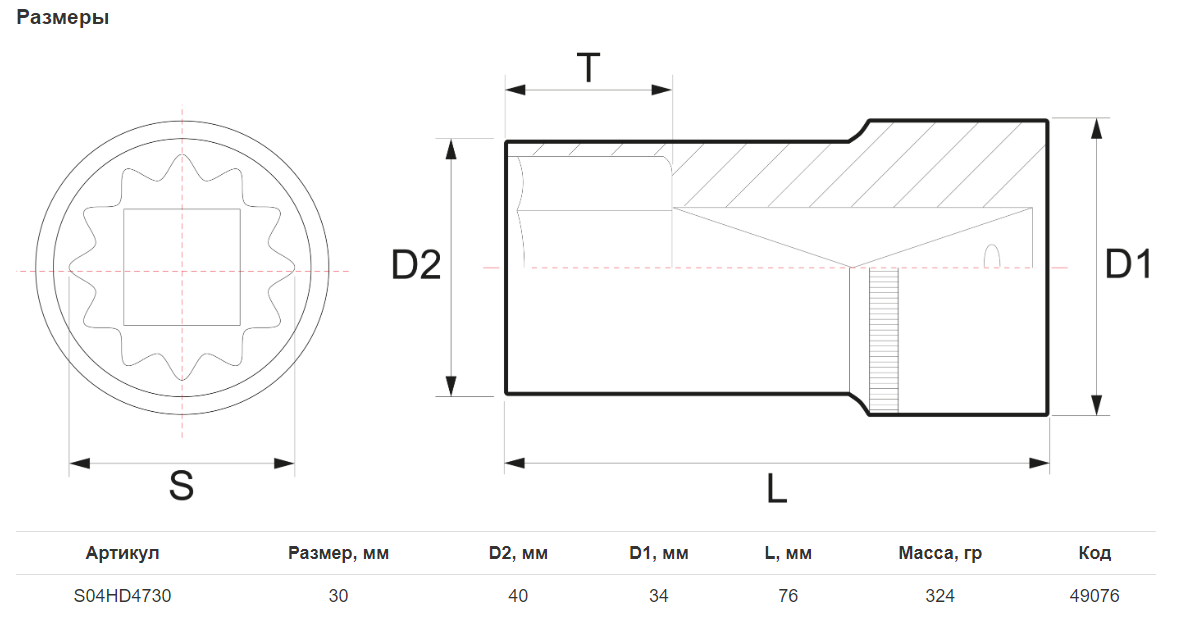 Двенадцатигранная торцевая головка увеличенной длины. Применяется при работе с крепежом на относительно высоких шпильках и заглубленных деталях. Двенадцатигранные головки удобнее в применении по сравнению с 6-гранным, так как какой профиль предоставляет большую свободу для позиционирования головки на крепеже. Однако, он обладает меньшим по площади пятном контакта и воздействие на крепеж, особенно с высокой нагрузкой, может повредить грани крепежной детали, что в сочетании с большим количеством концентраторов напряжения несколько ограничивает применяемые максимально допустимые нагрузки, опять же, по сравнению с 6-гранными головками.