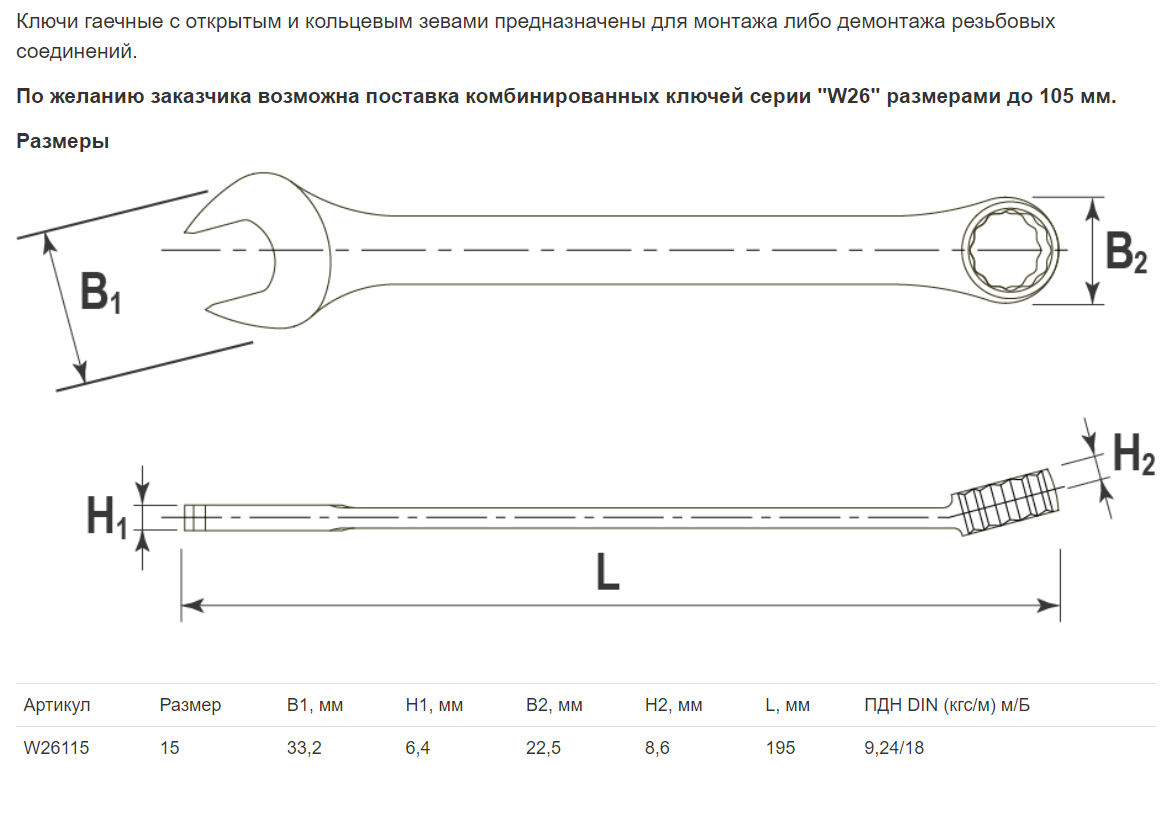 По желанию заказчика возможна поставка комбинированных ключей серии "W26" размерами до 105 мм.