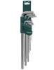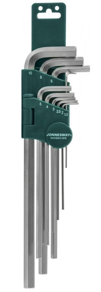 Набор угловых шестигранников EXTRA LONG 1,5-10мм, 9 предметов. Согнутый под углом 90° стержень с рабочими профилями одного размера на обоих концах, сочетает в себе относительное удобство использования с возможностью приложения значительных рабочих нагрузок, когда в качестве ручки используется длинная часть и работу в труднодоступных местах, когда в качестве воротка используется короткая. Комплект угловых шестигранников удлиненных "H03SM109S" изготовлен из стали S2 в соответствии с требованиями ГОСТ 11737-93, имеет матовое хромоникелевое покрытие.