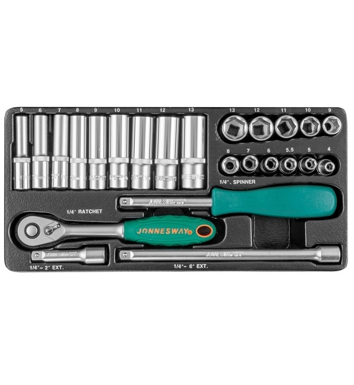 - Головки торцевые глубокие, 9 шт.: 5, 6, 7, 8, 9, 10, 11, 12, 13 мм.;
