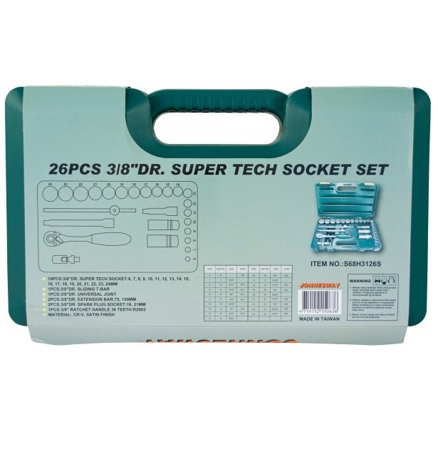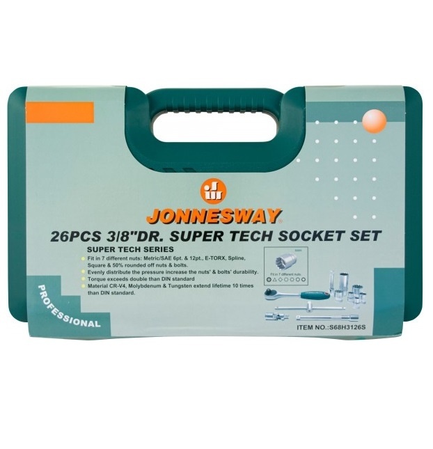 Набор головок торцевых 3/8"DR Super Tech, 26 предметов. Революционная система слесарно-монтажного инструмента "SUPERTECH". Пятно контакта с крепежом распределено по большей площади, в отличие от стандартного профиля, имеющего точечные пятна контакта. Крепежные детали меньше подвержены повреждению при работе с профилем "SUPERTECH". Изделия изготовлены с применением современных технологий из улучшенной высоколегированной хромованадиевой стали с добавлением молибдена и вольфрама, что позволяет продлить срок эксплуатации инструмента до 10 раз, и увеличивает вдвое максимально допустимые нагрузки.