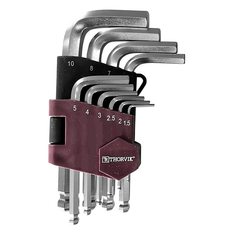 Набор ключей торцевых шестигранных коротких с шаром, H1.5-H10, 10 предметов. Торцевые Г-образные ключи обеспечивают доступ к крепежу в ограниченном рабочем пространстве. Изготовлены из легированной хромованадиевой стали по технологии, позволяющей при использовании прилагать высокие нагрузки.