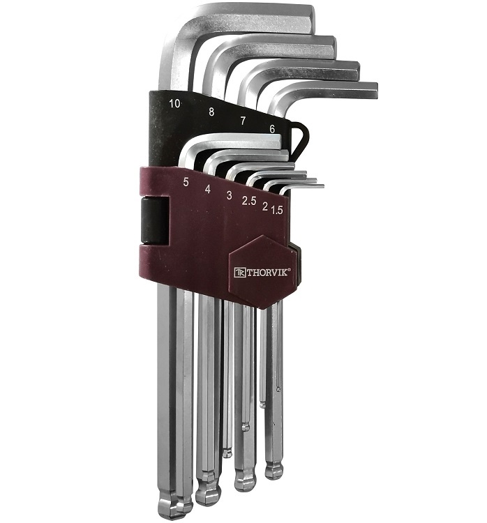 Набор ключей торцевых шестигранных с шаром, H1.5-H10, 10 предметов. Торцевые Г-образные ключи обеспечивают доступ к крепежу в ограниченном рабочем пространстве. Изготовлены из легированной хромованадиевой стали по технологии, позволяющей при использовании прилагать высокие нагрузки.