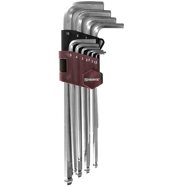 Набор ключей торцевых шестигранных удлиненных с шаром, H1.5-H10, 10 предметов. Торцевые Г-образные ключи обеспечивают доступ к крепежу в ограниченном рабочем пространстве. Изготовлены из легированной хромованадиевой стали по технологии, позволяющей при использовании прилагать высокие нагрузки.