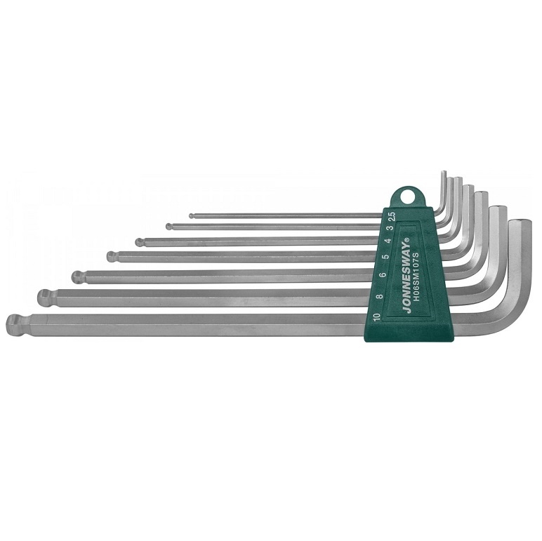 Согнутый под углом 90° стержень с рабочими профилями одного размера на обоих концах, сочетает в себе относительное удобство использования с возможностью приложения значительных рабочих нагрузок, когда в качестве ручки используется длинная часть и работу в труднодоступных местах, когда в качестве воротка используется короткая. Комплект угловых шестигранников удлиненных "H06SM107S" изготовлен из стали S2 в соответствии с требованиями ГОСТ 11737-93, имеет матовое хромоникелевое покрытие. Наличие шарового наконечника на длинной части инструмента позволяет дополнительно использовать инструмент под углом до 20° к оси вращения крепежной детали.
