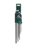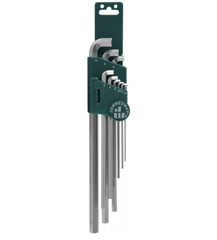 Набор ключей торцевых шестигранных для труднодоступных мест, 9 предметов. Согнутый под углом 90° стержень с рабочими профилями одного размера на обоих концах, сочетает в себе относительное удобство использования с возможностью приложения значительных рабочих нагрузок, когда в качестве ручки используется длинная часть и работу в труднодоступных местах, когда в качестве воротка используется короткая. Комплект угловых шестигранников, укороченных "H03SS109S" изготовлен из стали S2, имеет матовое хромоникелевое покрытие и применяется для обслуживания резьбовых крепежных деталей с внутренним шестигранным рабочим профилем в труднодоступных и осложненных местах.
