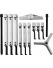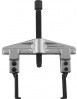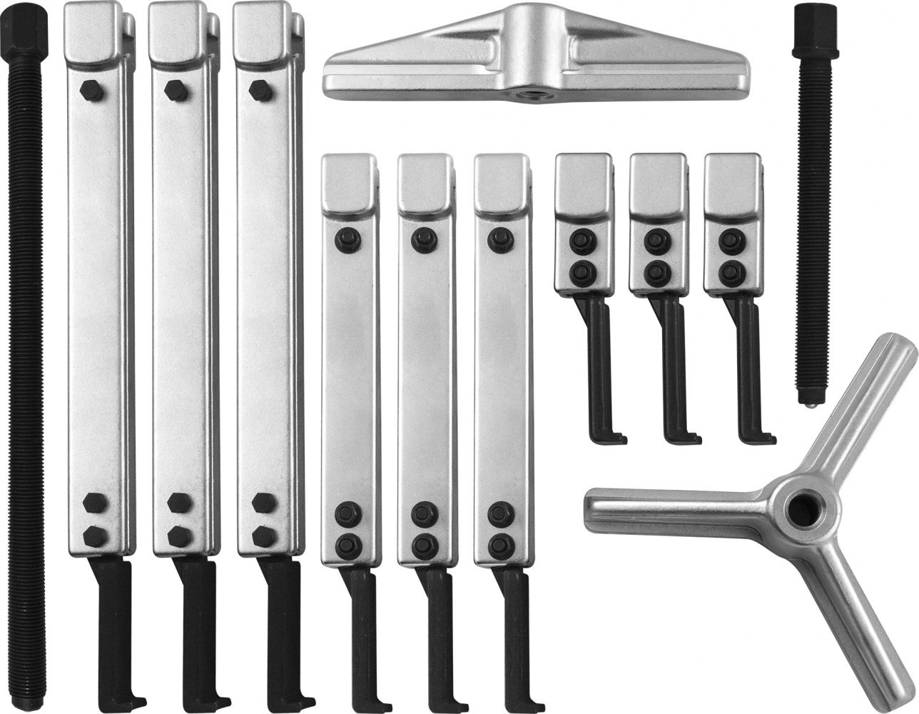 Съемник с тремя комплектами скользящих составных захватов, откованных из двух марок легированных сталей, износостойкой для лапок захвата и высокопрочной для направляющих. Набор комплектуется двумя траверсами, позволяющими применять, в зависимости от выполняемой работы, 2 или 3 захвата, диаметр захватываемой детали за внешнюю часть 40-120 мм, за внутреннюю 60-160 мм. Наличие дополнительного ходового винта расширяет область применения изделия.